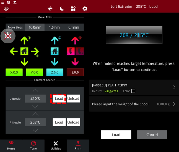 3)Select the “Load” button and the printer will begin to heat. When it reaches the target temperature, select "Load".