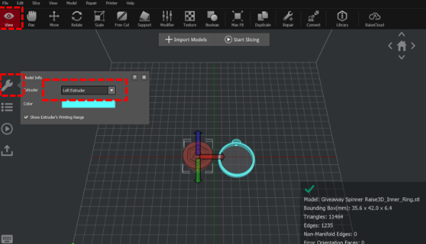 3. Select one of the two models, click “View > Model Info (wrench icon) > Extruder” on the left side, and select “Left Extruder” in the drop-down list. Each nozzle has a different printing range. You can tick the “Show Extruder’s Printing Range” to display the printable area of the nozzle. You can also assign different colors to each nozzle to distinguish them.