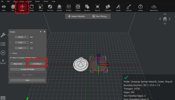 2. With the model(s) selected, click “Move > On Platform” to place the model(s) on the build plate. Laying the model flat on the build plate allows you to use less support (or eliminate the need) for the model, thus improving the printing efficiency.