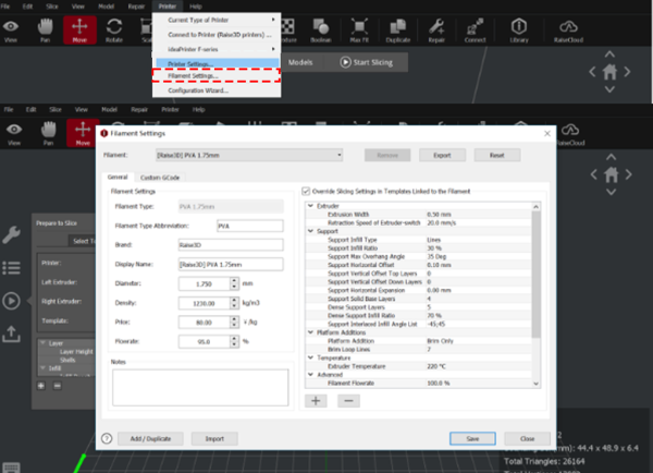 When a nozzle is assigned to print with PVA filament, ideaMaker will automatically edit some additional settings to get better printing performance with PVA filament. This will disable some settings under the “Advanced” menu and these settings will not be directly editable. If you want to edit these settings, you can navigate to “Printer > Filament Settings > PVA 1.75mm”; Or you can directly click the pencil icon on any tabs of “Advanced Settings” and ideaMaker will directly jump to the filament template, making it convenient for you to edit the parameters.