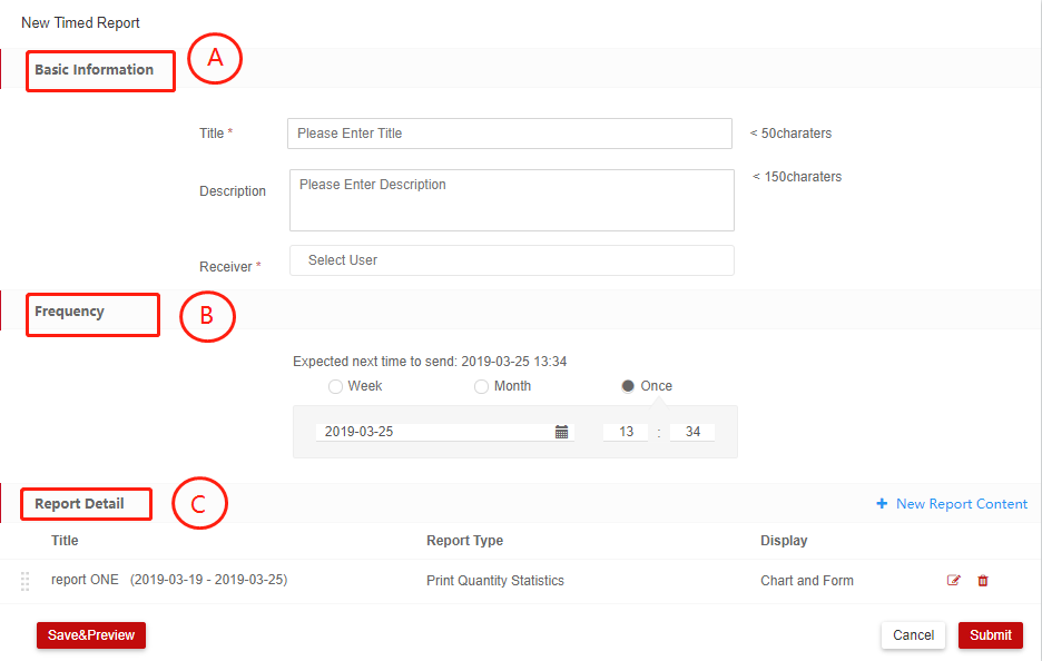System will send timed reports based on the frequency set by user in New Timed Report. User can check the timed reports in Scheduled Reports.