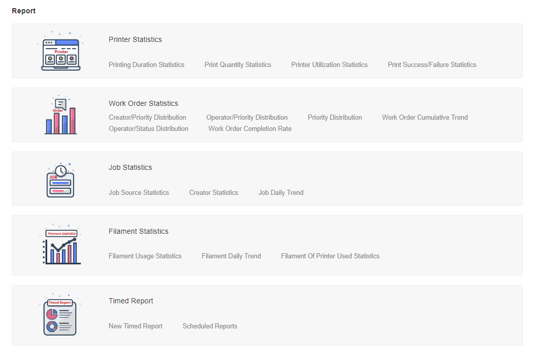 The Report module allows a user to check statistics about printers, work orders and printing jobs.