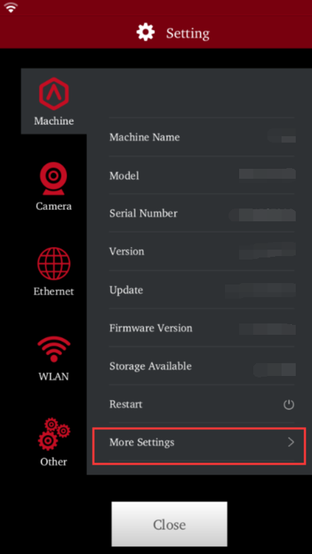 1. Tap on Settings (Gear icon) at the top right of the touchscreen. In the Machine tab, tap on More Settings;