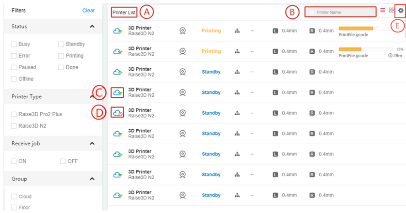This part allows user to check the model, status, group and other related information about the 3D printers in the team.