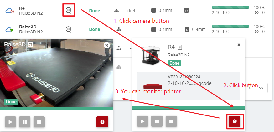 1. By clicking the camera button, users can monitor printers with Popup View.