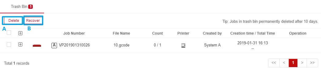 Printing jobs in Trash Bin will be deleted after 10 days.