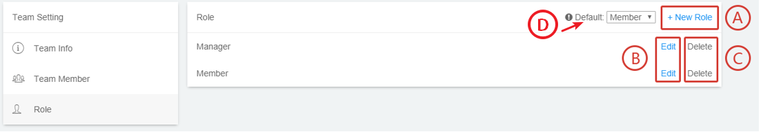 Click Delete button to Delete Role. Member and Manager Role cannot be Deleted.