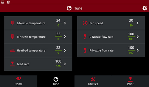 The Tune interface shows the parameters associated with the movement of the printer. Including: