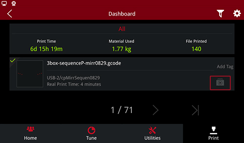 The Timelapse can be viewed on the touch screen under “Print > Dashboard”.