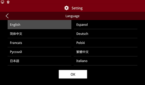 Choose the language applied to your printer. Options are available in English, simplified Chinese, French, Russian, Japanese, Spanish, Polish, Traditional Chinese and Italian.