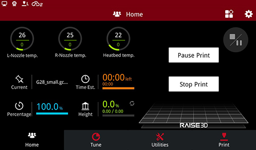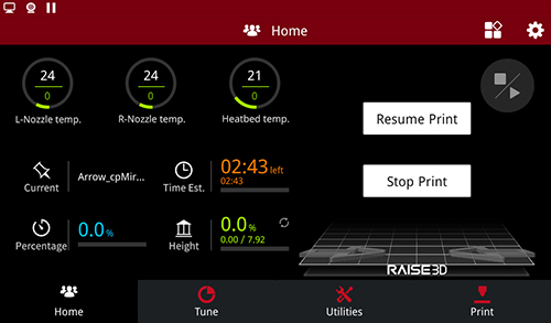 When the filament runs out during printing, replace with new filament, by pressing the pause button on the home interface.