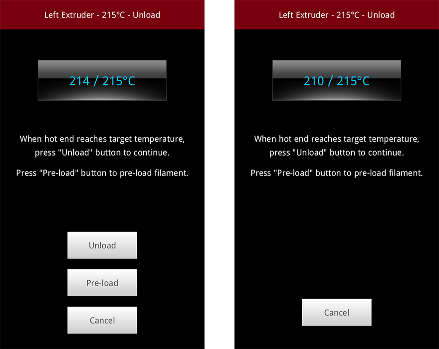 Click the unload button to enter the nozzle preheating interface. When the temperature of the nozzle reaches the set temperature, two new buttons are added, respectively, "Unload" and "Pre-load".