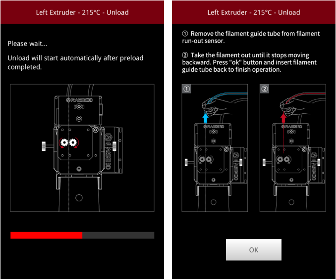 Click the "pre-load" button, and the printer will automatically pre-load the filament, which also shows the progress of the pre-load. When the pre-load is finished, the printer will begin to unload the material automatically. Click "OK" to finish unloading.