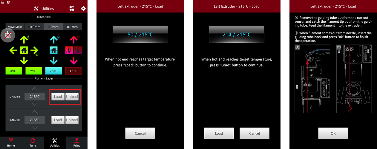 Click the "load" button to enter the nozzle preheating interface. Click the "load" button when the temperature of the nozzle reaches the set temperature, and the system will start to load automatically. Click OK to finish loading.