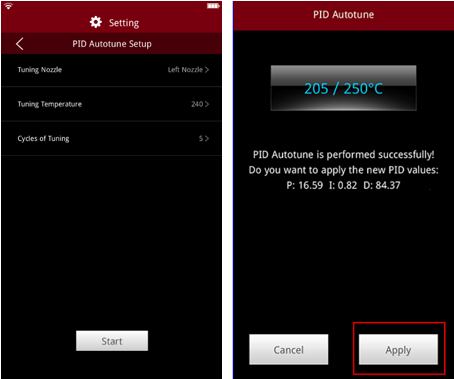 Click to enter the Auto Tuning interface, to select nozzle to be adjusted, set the required temperature and adjustment times, then click "Start". When the nozzle temperature is heated to the set temperature, select "Apply", the PID values will be applied to the screen.