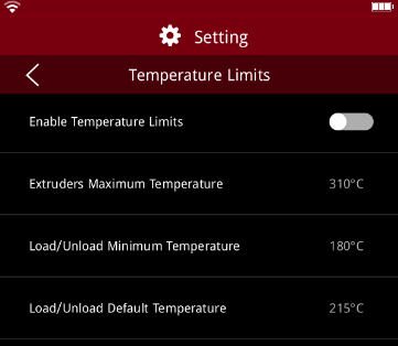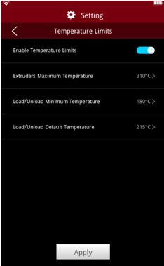 Enable the temperature limit to set the minimum temperature of the nozzle, the minimum temperature of the load/unload and the default temperature. Click "Apply". The system will automatically apply the set temperature value to the relevant interface and function after restarting the screen.