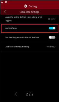 2. Motion controller board firmware 0-0-66 is required to enable fast pause function.