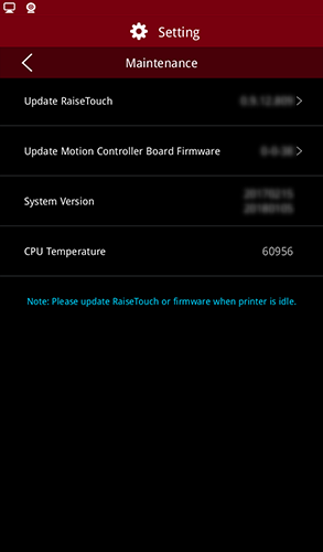 This interface introduces the version number of RaiseTouch, motion board and system. You can check the CPU temperature, RaiseTouch and hardware update in this interface.