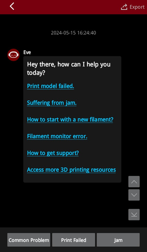 at the top left corner of the interface. If abnormal printing occurs, you can enter EVE to report the error, check how to deal with common problems, learn how to get after-sales support, get more 3D printing resources, etc.