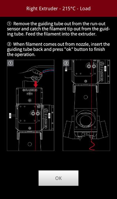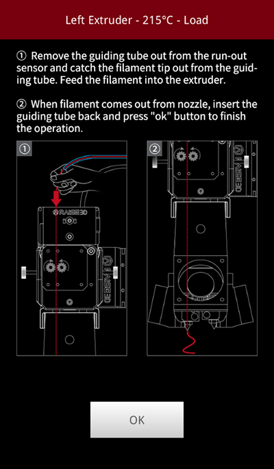 After a small amount of extruded filament comes out from the nozzle Press "OK" button.