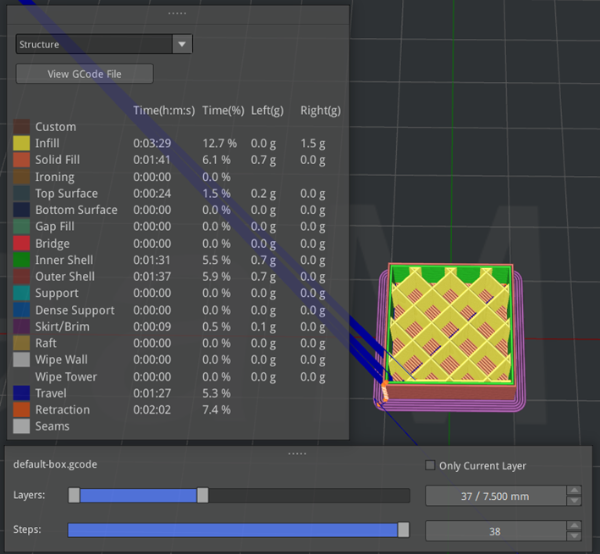 If you select Structure from the drop-down menu, different colors will display different structures of the model. The estimated print time and amount of material for each structure will also be displayed.