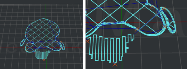 Figure 3: Dark blue lines display the travel routes of the nozzle, and orange crosshairs display the retraction points.