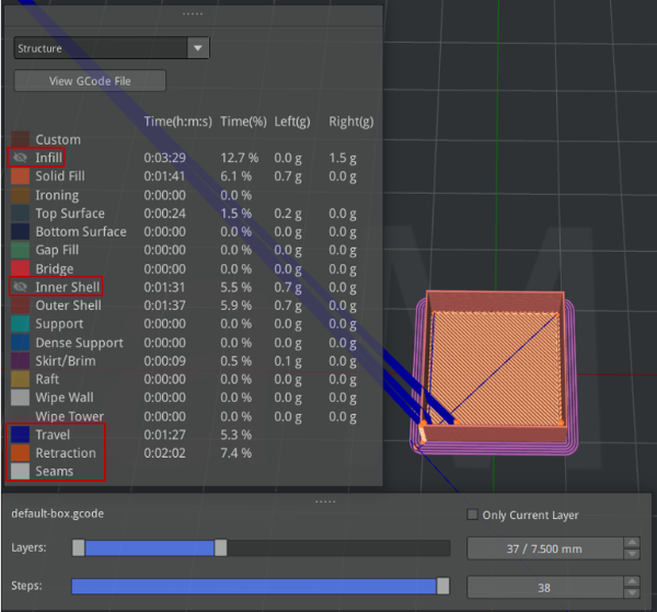 For example, as shown in Figure 2 below, the yellow for Infill and the green for Inner Shell are hidden.