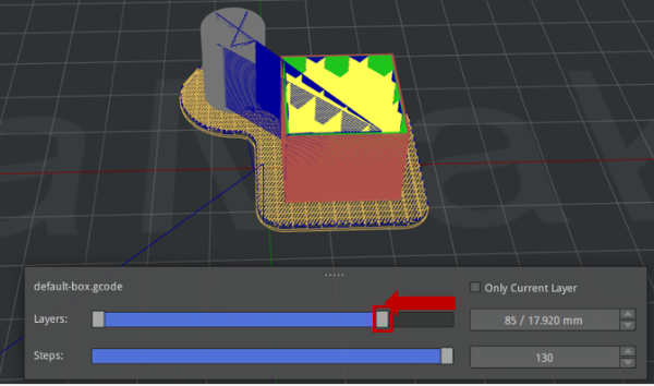 Drag the slider next to Layers to preview the sliced model layer by layer. Drag the left slider from left to right to preview the model from bottom to top and drag the right slider from right to left to preview the model from top to bottom.