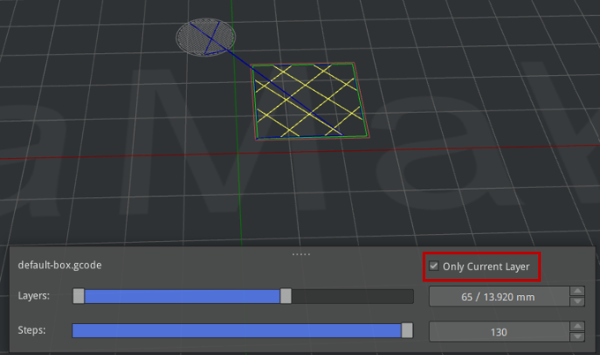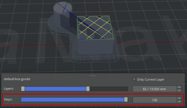 Drag the slider after the Steps to preview the current layer of the sliced model step by step. Previous layers of the model will be displayed in dark gray. If Only Current Layer is checked, the previous layers of the model will not be displayed.
