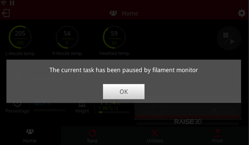 The ideaMaker version 3.4 or later and RaiseTouch version 1.2 or later will show the reason for pausing printing task.