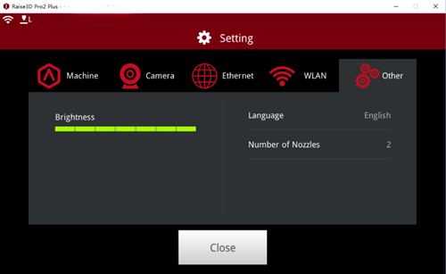 : Opens the settings interface, providing access to printer details like the serial number, firmware version, and available storage, as well as more advanced settings