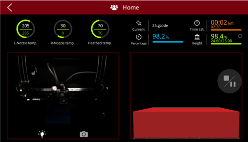 L-Nozzle temp: the temperature of the left nozzle. Upper value is current temperature. Lower value is target temperature.