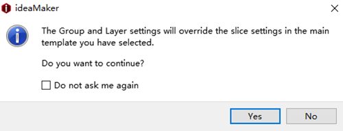 Confirm slicing with Group and Layer Settings when enabled, ideaMaker will pop-up a dialog to confirm whether to continue slicing with override parameters in Group and Layer Setting as Figure 2.