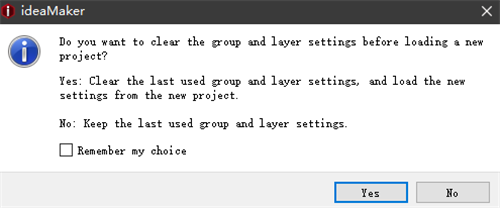 Confirm clearing Group and Layer Settings before loading a new project with this function enabled, ideaMaker will pop-up a dialogue box to confirm whether to clear Group and Layer Settings before importing a new project.
