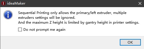 Conform slicing with sequential printing means ideaMaker will issue a pop-up box with warnings when slicing with sequential printing as Figure 5.