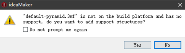 Confirm adding supports for floated models with this function enabled, ideaMaker will pop-up a dialogue box to confirm whether to add support before slicing.