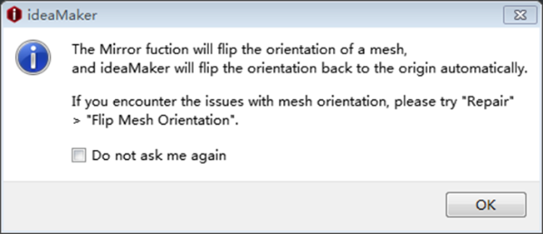 Show tips for Model Mirror Function with this function enabled, ideaMaker will pop-up a dialog to show tips for the model mirror function as Figure 7.