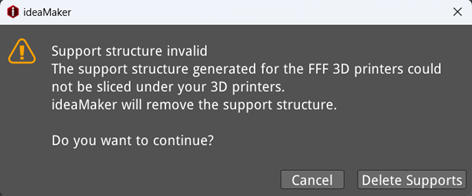 When the model has FFF supports and needs to be transferred to a DLP printer, you will be notified that the support structure invalid. If you click Cancel, you will undo the printer switch and return to the original FFF printer; if you click Delete Supports, the FFF supports will be automatically deleted and ideaMaker will switch to the target printer.