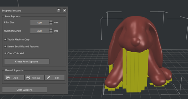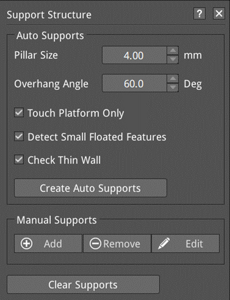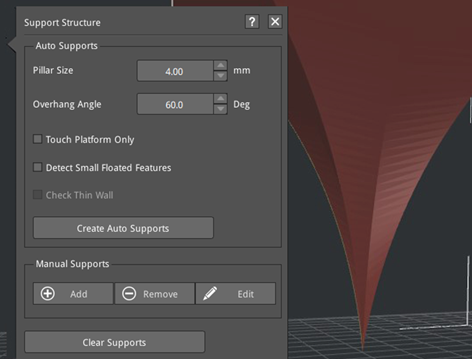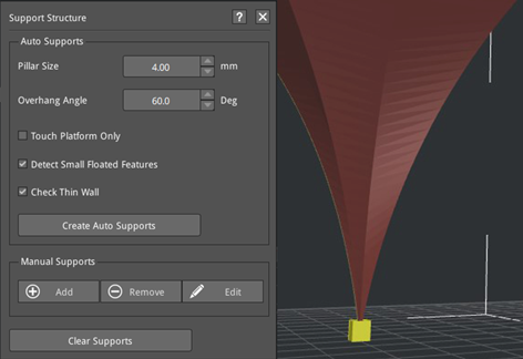 Figure 4: You can set the Pillar Size and Overhang Angle first. And try Create Auto Supports. Then adjust the support with Manual Supports.