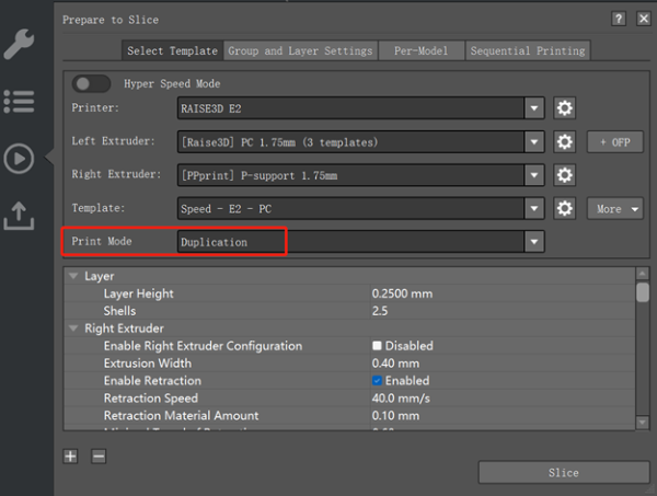 Note: For the Raise3D E2 printer it will show three options in Print Mode: Normal, Duplication and Mirror.
