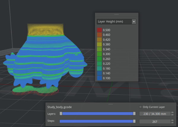 For example, extrusion width is 0.4mm, set Adaptive Layer Height Maximum Height to 100% and Adaptive Layer Height Minimum Height to 25%. That means the maximum allowed layer height is 0.4mm, and minimum allowed layer height is 0.1mm. ideaMaker will figure out each structure’s layer height between 0.1mm and 0.4mm based on your model. The preview after slicing is shown in the following Figure 2.
