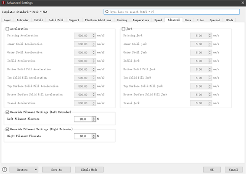 Jerk Settings support for Delta printers with this function enabled, ideaMaker will output M205 XYZ command to control the jerk value of Delta Printers.