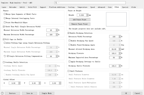 You can define the height by clicking the Add Pause Point button. And delete the defined height by selecting the value in right box and clicking the Remove Pause Point button.