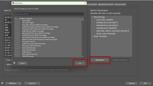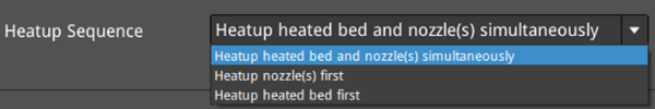 Insert Heatup GCode Automatically in Start GCode: The heatup GCode will be inserted into the Start GCode automatically. This should always be inserted in the Start GCode, otherwise the printer will start printing without heating the nozzle or the heated bed. If you want to change the Heatup GCode to a custom code, please disable this option and input your codes.