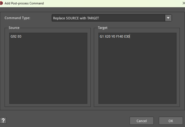 Figure 12: Insert the GCode commands into the Source and Target lists.