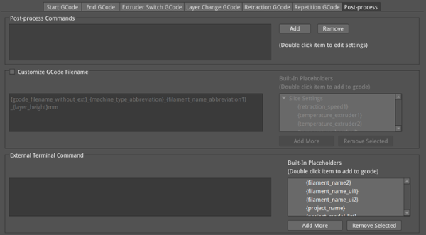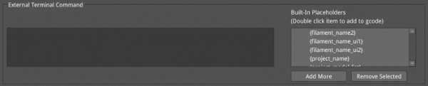 External Terminal Command: Supports calling external commands or programs to further process the file before exporting or loading GCode file. Users can add third-party programs such as ArcWelder.