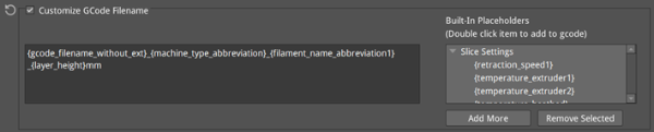 With this function enabled, the GCode file name can be defined by users. For example, if the printer type is Raise3D Pro2 (abbreviated as R3D_PRO2), the material type is PLA 1.75mm (abbreviated as PLA), the slice template’s layer height is 0.25mm and the model’s name is 20mm_Calibration_Box, the exported GCode file name after slicing will be “20mm_Calibration_Box_R3D_PRO2_PLA_0.2500mm”.