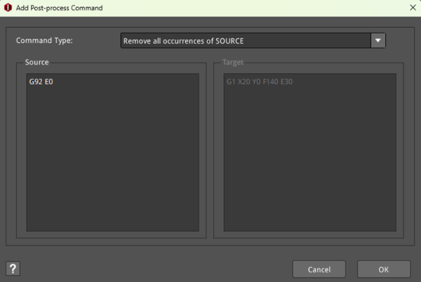 For example, insert "G92 E0" into Source list and insert "G1 X20 Y0 F140 E30" into Target list, as shown Figure 12, and then set the Command Type to Remove all occurrences of SOURCE. Press OK button, and the Post-process Command will be edit, as shown in Figure 13.