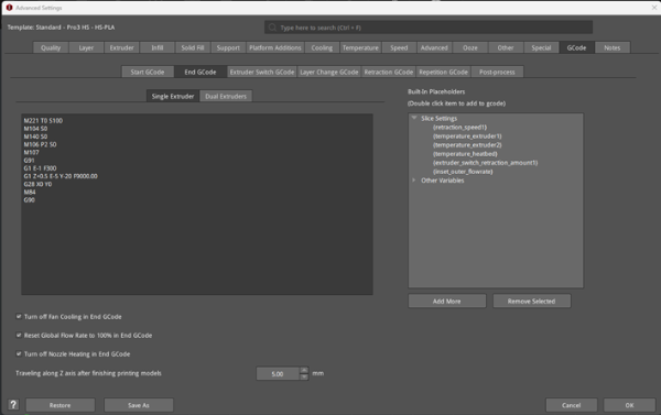(2) End GCode: The GCode that is executed at the end of a print job.