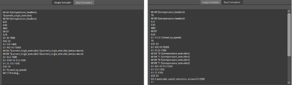 Figure 2: The initial GCode for the Single Extruder (Left) and the Dual Extruders (Right).